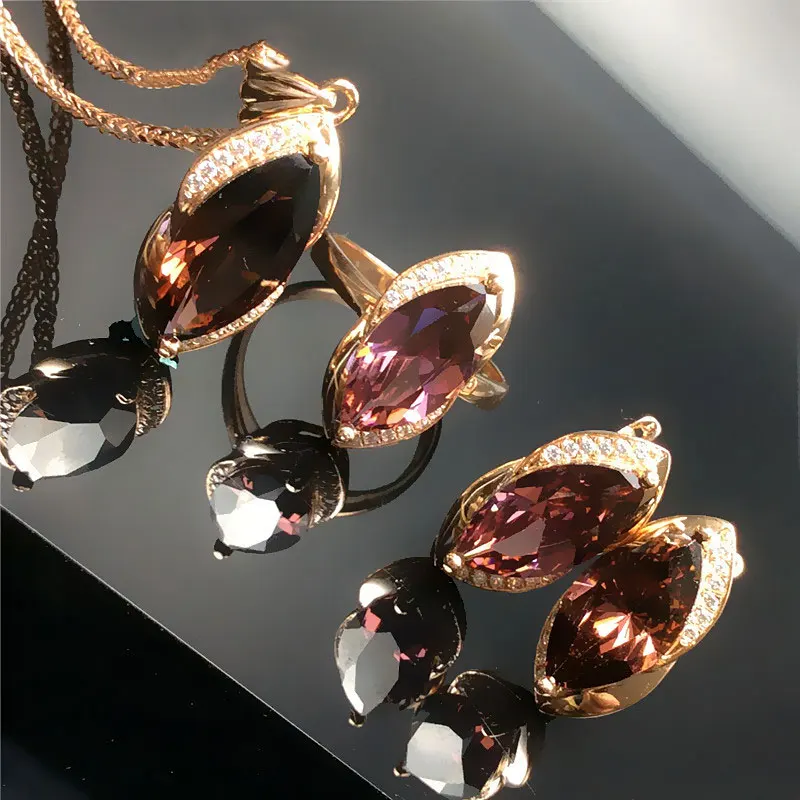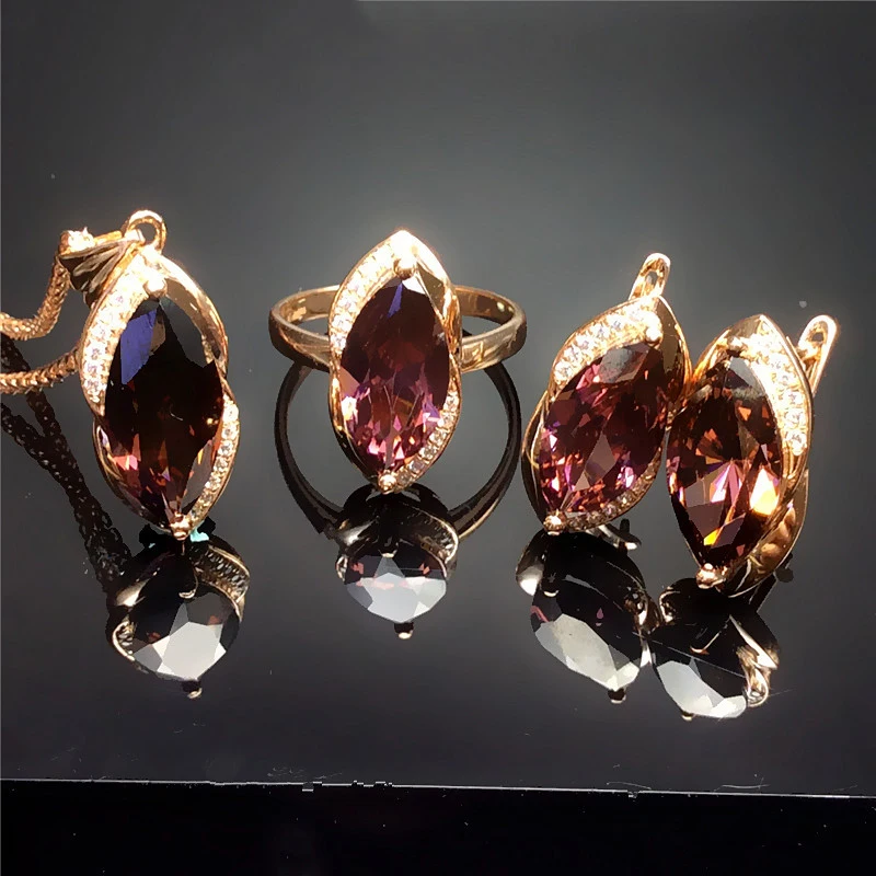 585 Purple Gold Plated 14K Rose Gold Inlaid Marquise Ruby Women’s Jewelry Set New Classic Luxury Wedding earrings rings